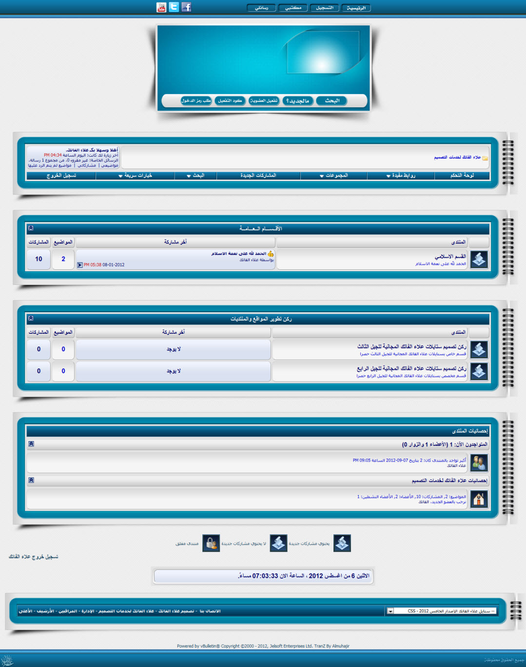 تم تصميم الستايل للنسخة 3.8 ويمكن تركيبة لجميع نسخ الجيل الثالث فقط قبل إستيراد ملف الستايل من لوحة التحكم علّم على تجاهل إصدار الستايل ثم إستورد ملف الستايل صورة للستايل https://mwadah.com/attachment.php?at...9&d=1344271999 مميزات الستايل :: تم تصميم الستايل بتقنية CSS بالكامل والخالية من الخطاء . تم تأطير اغلب قوالب الستايل التجميلة . تم أضافة عدد لابأس به من الأزرار والروابط المهمة في الهيدر . تم إضافة المواقع الإجتماعية في أعلى الهيدر ( فقط أضف روابط صفحاتك موقعك بدل الرمز # ) وأضغط حفظ . تم إضافة تاجات H1 و H2 في المواضيع والأقسام لزيادة الأرشفة تم تجميل البوست ليجاسي وتأطيرة . توافق الستايل مع كل المتصفحات بدون أي مشكلة تذكر . تجميل الستايل بالحدود الدائرية بتقنية CSS . تم إضافة زر أعجبني للموضوع وفقط لأول مشاركة . تم إضافة زر تغريدات تويتر داخل الموضوع وفقط لأول مشاركة . تم إضافة زر قوقل بلس داخل الموضوع وفقط لأول مشاركة . الستايل خفيف جدا وسريع جدا . لتحميل الاستايل اضغط على الرابط https://top4top.io/downloadf-2602nsbcs1-rar.html |